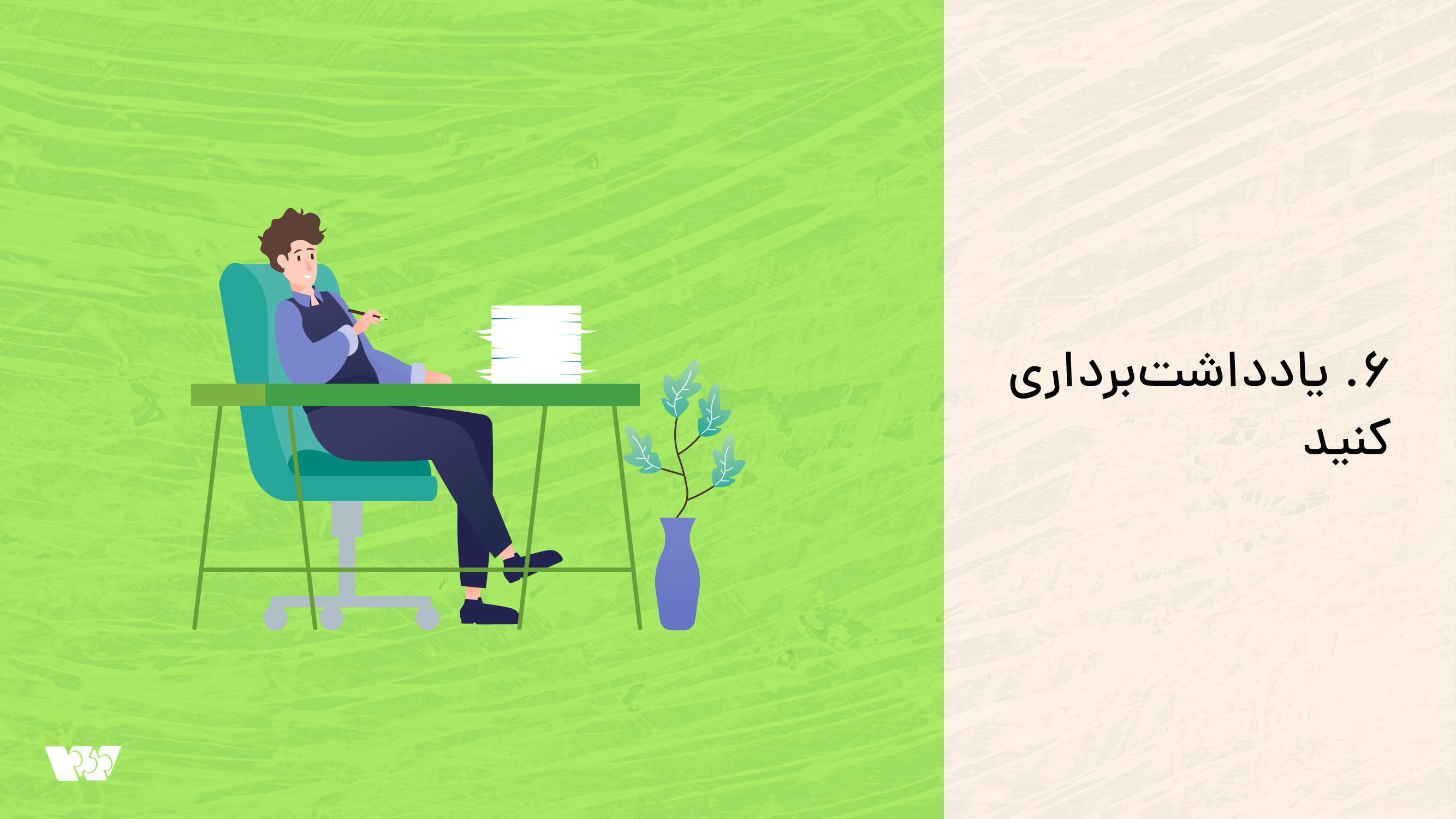 مزیت اصلی یادداشتبرداری در طول جلسه این است که کمک میکند نگرانیها و درخواست افراد را بعد از جلسه بررسی کنید. همچنین باید از شرکتکنندگان بخواهید که یادداشتبرداری کنند و نکات مهم جلسه را بنویسند.
