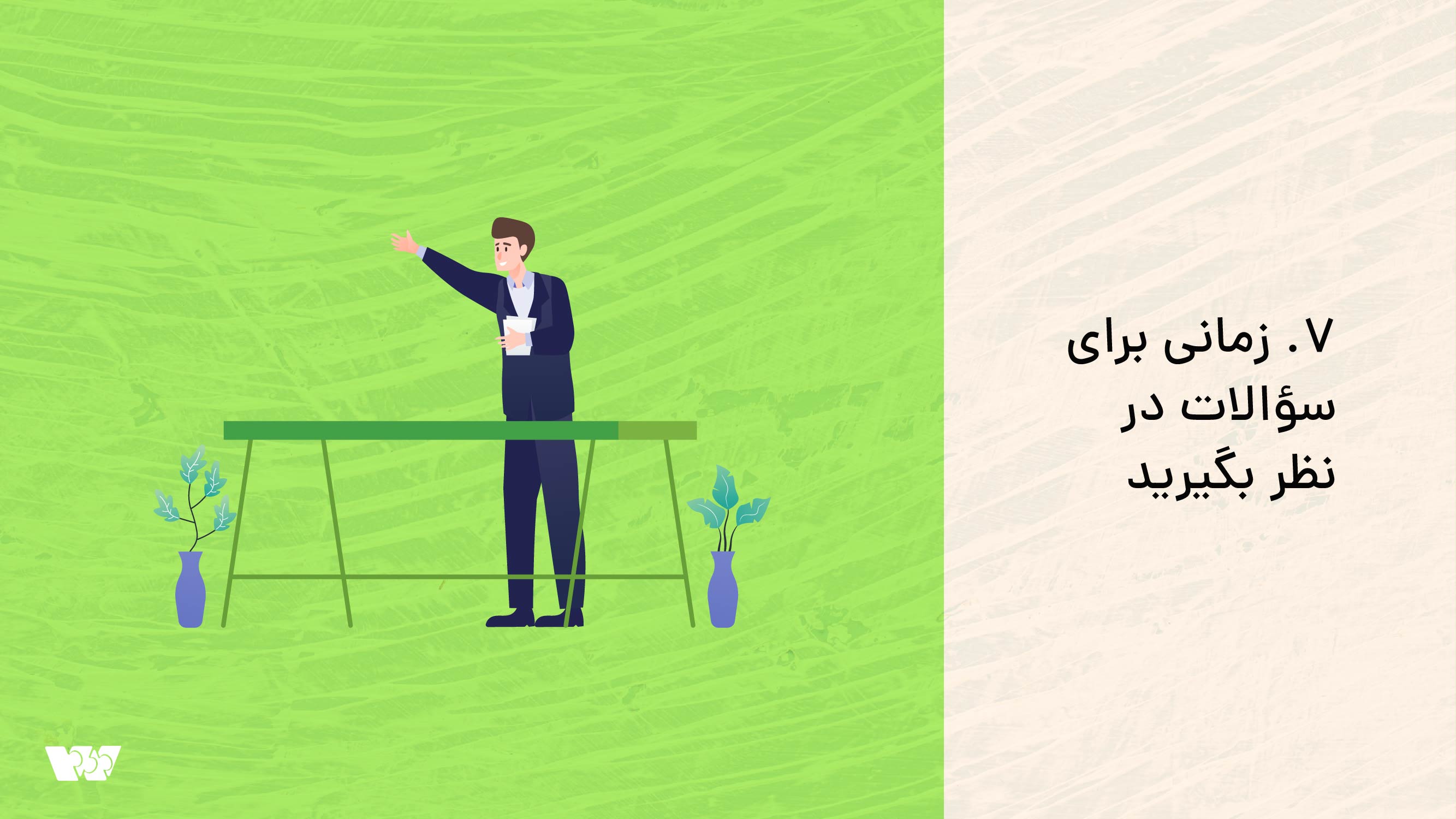 در زمان برنامهریزیِ جلسه، زمانی را برای پرسش و پاسخ در نظر بگیرید. این کار به شرکتکنندگان کمک میکند تا نظرات افراد مختلف را شنیده و هر چیزی را که متوجه نشدهاند، برای خود روشن کنند. علاوه بر این، وقتی به شرکتکنندگان اطلاع میدهید که زمانی را برای پرسش و پاسخ اختصاص دادهاید، احتمال کمتری وجود دارد که افراد در سایر لحظهها بخواهند سؤالی بپرسند.