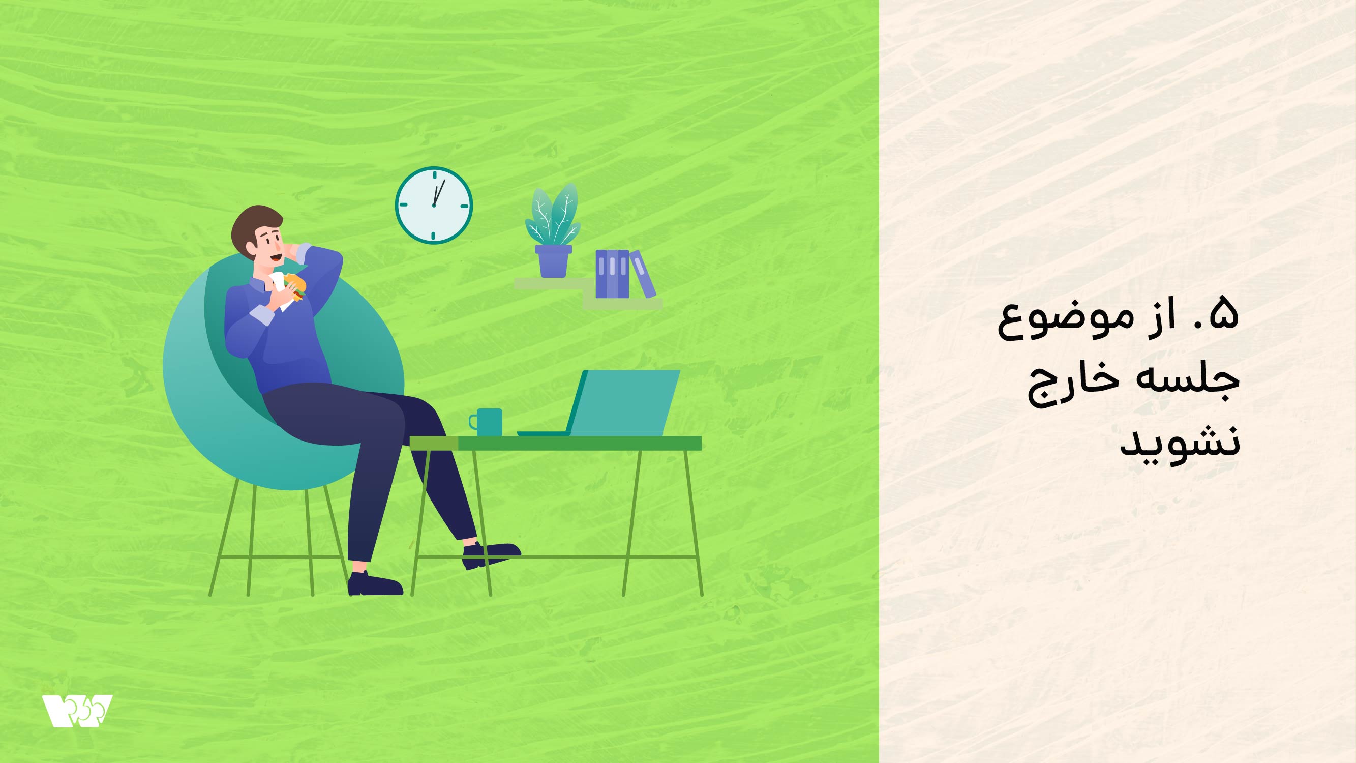 برای این کار، میتوانید یک نفر را تعیین کنید که اگر در حین جلسه، مسیر صحبت شما یا شرکتکنندگان تغییر کرد، موضوع اصلی جلسه را یادآوری کند. با این کار، هم زمان جلسه بهخوبی مدیریت میشود و هم اینکه نتیجۀ بهتری از آن جلسه خواهید گرفت.