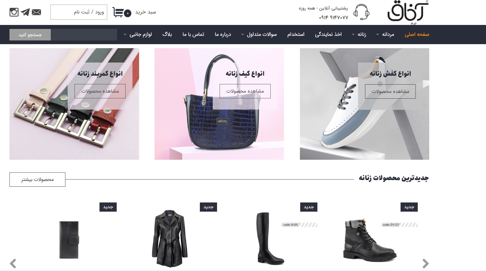 همانطور که میبینید، در صفحۀ اصلی این وبسایت دستهبندی محصولات زنانه بهصورت «انواع کفش زنانه»، «انواع کیف زنانه و «انواع کمربند زنانه» تقسیمبندی شده است. در واقع صفحۀ اصلی نقطۀ شروع کاربر است و لینکسازیها و ناوبری بهترتیب کاربر را بهسمت خرید هدایت میکند. این فروشگاه با استفاده از فروشگاه ساز وبزی طراحی شده است.