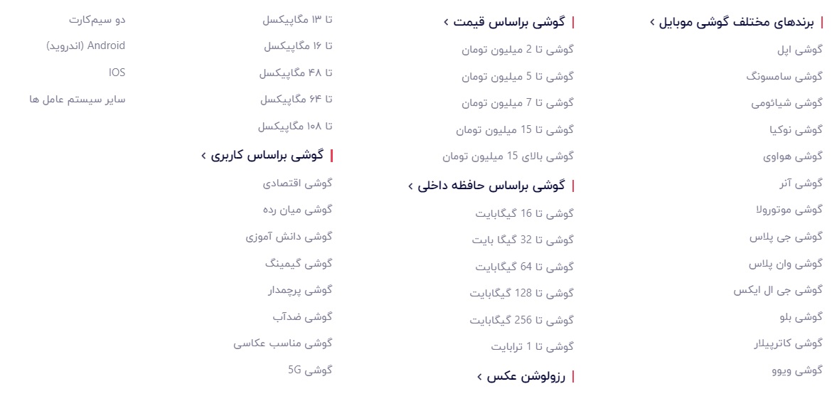 برای مثال، اگر یک فروشگاه اینترنتی موبایل داشته باشید دستهبندی محصولات شما میتواند به شکل زیر باشد: