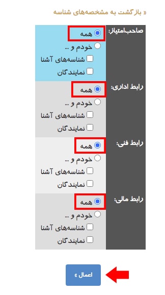 در این صفحه گزینه های صاحب امتیاز، رابط اداری، رابط فنی و رابط مالی را روی آیتم «همه» قرار دهید و روی دکمه اعمال کلیک کنید.