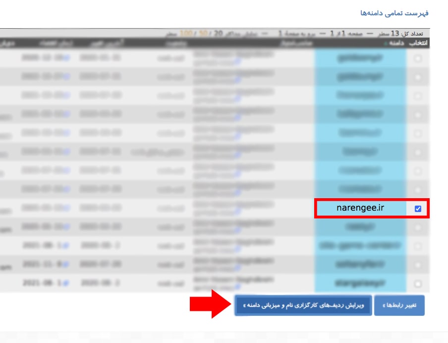 بد ین منظور کافیست وارد پنل مدیریت خودتان در سایت ایرنیک شده و از نوار بالا قسمت دامنه > دامنه های من، دامنه مورد نظر را انتخاب کرده و گزینهی «ویرایش ردیفهای کارگزاری نام و میزبانی دامنه» را انتخاب کنید (طبق تصویر زیر)