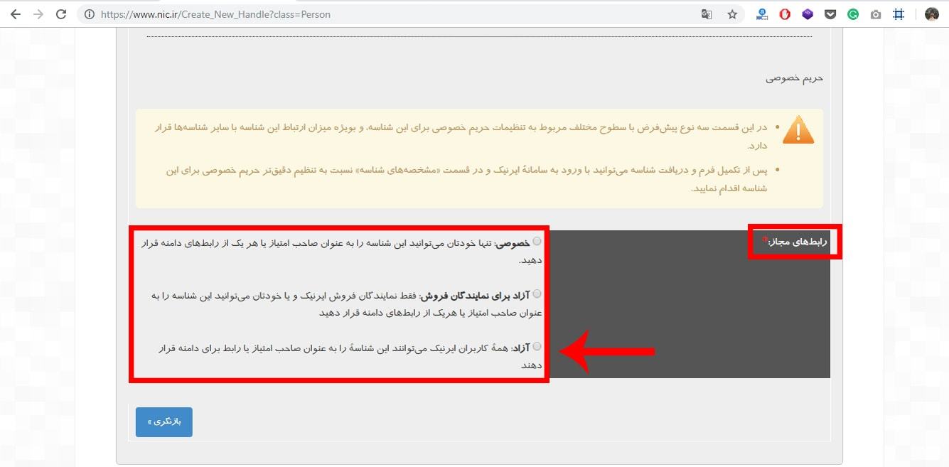 در صورتی که قصد دارید شناسه (و مالکیت دامنه ها را) به نام شرکت، مؤسسه یا نهاد غیردولتی، وزارتخانه، سازمان یا شرکت دولتی، مرکز آموزشی و پژوهشی ثبت کنید لازم است تا از گزینههای مربوط به هرکدام ثبت نام را انجام دهید.